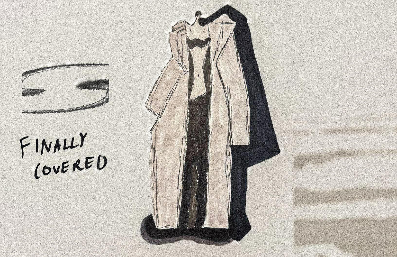 THIS LINEUP SKETCHING PROJECT WAS INSPIRED BY THE DYNAMICS OF POWER - IN VARIOUS FORMS AS WELL AS IN INTERPERSONAL RELATIONSHIPS . THIS LINEUP ALSO WAS CRAFTED IN THE PURSUIT OF EXPLORING SEXUALNESS AND SEXUALITY IN DESIGN . OVERSIZED STREETWEAR MOTFIS ARE INCORPORATED AS WELL AS THE THEME OF HIDING AND PROTECTIVENESS / " ANONYMITY " . THE REPEATED USE OF REFLECTIVE SILVER FABRICS REPRESENT BEING VULNERABLE AND EXPOSED IN THE PRESENCE OF ONE ANOTHER .